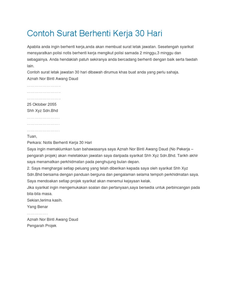 Ini adalah kerana supaya anda tidak dikenakan sebarang tindakan oleh pihak syarikat. Surat rasmi berhenti kerja atau resignation letter salah satu surat rasmi yang penting. Ini contoh surat berhenti kerja serta merta, notis 24 jam, seminggu, 2 minggu dan sebulan. Surat berhenti kerja serta merta, notis 24 jam, dalam masa 14 hari kebiasaannya ini adalah tempoh berhenti kerja yang disenangi majikan dan pekerja. Contoh surat berhenti kerja kilang dengan notis 24 jam.